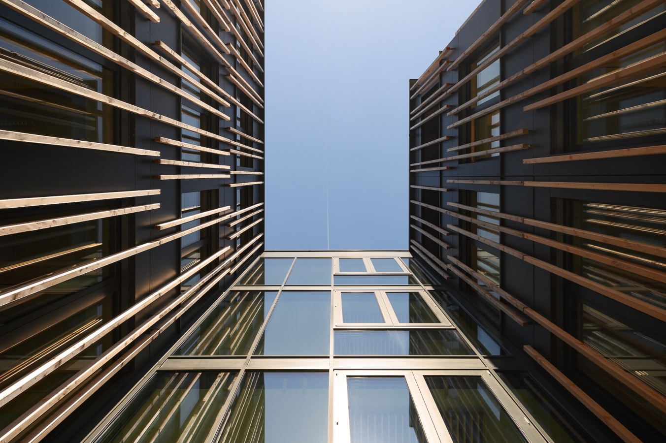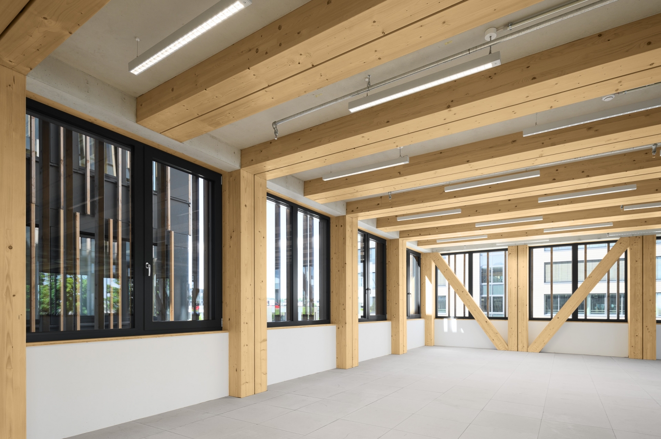 The Allégra project consists of two staggered building volumes connected by a central circulation core. Cantilevered sections create covered terraces and contribute to an open, contemporary architectural expression. The hybrid structure is based on the CREE system, combining timber-concrete composite elements with an exposed glulam load-bearing framework. Two reinforced concrete cores provide structural stability and house the vertical circulation as well as the technical infrastructure. The façade is composed of prefabricated elements featuring Trespa panels and vertical wooden slats, resulting in a dynamic and lively appearance.