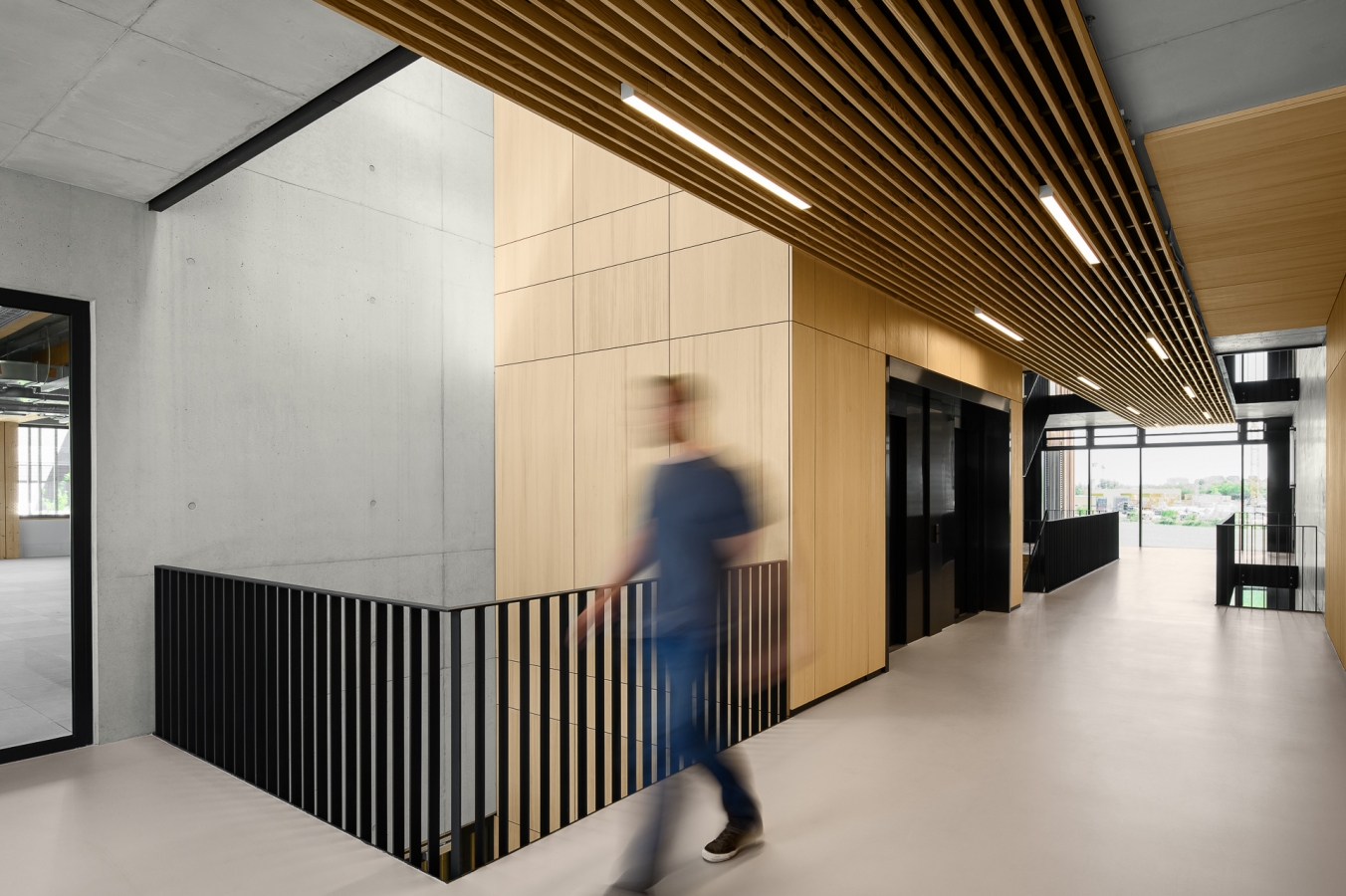 Inside, the floor plans are designed with openness and flexibility in mind, allowing the spaces to be adapted to tenants’ needs – from open-plan layouts to smaller office units. Sustainability was a key objective of the project: in addition to energy-efficient building components, geothermal energy, a photovoltaic system producing around 27,000 kWh annually, thermally activated concrete slabs, and an intelligent building management system all contribute to resource-efficient operation. The choice of materials followed strict ecological criteria to achieve BREEAM and Cradle-to-Cradle certifications.