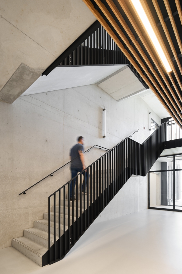 Thanks to the high degree of prefabrication, the façade and ceiling elements could be installed entirely without scaffolding. The weather-independent construction method enabled exceptionally fast progress: the north wing was completed in just nine weeks, and the south wing in four.