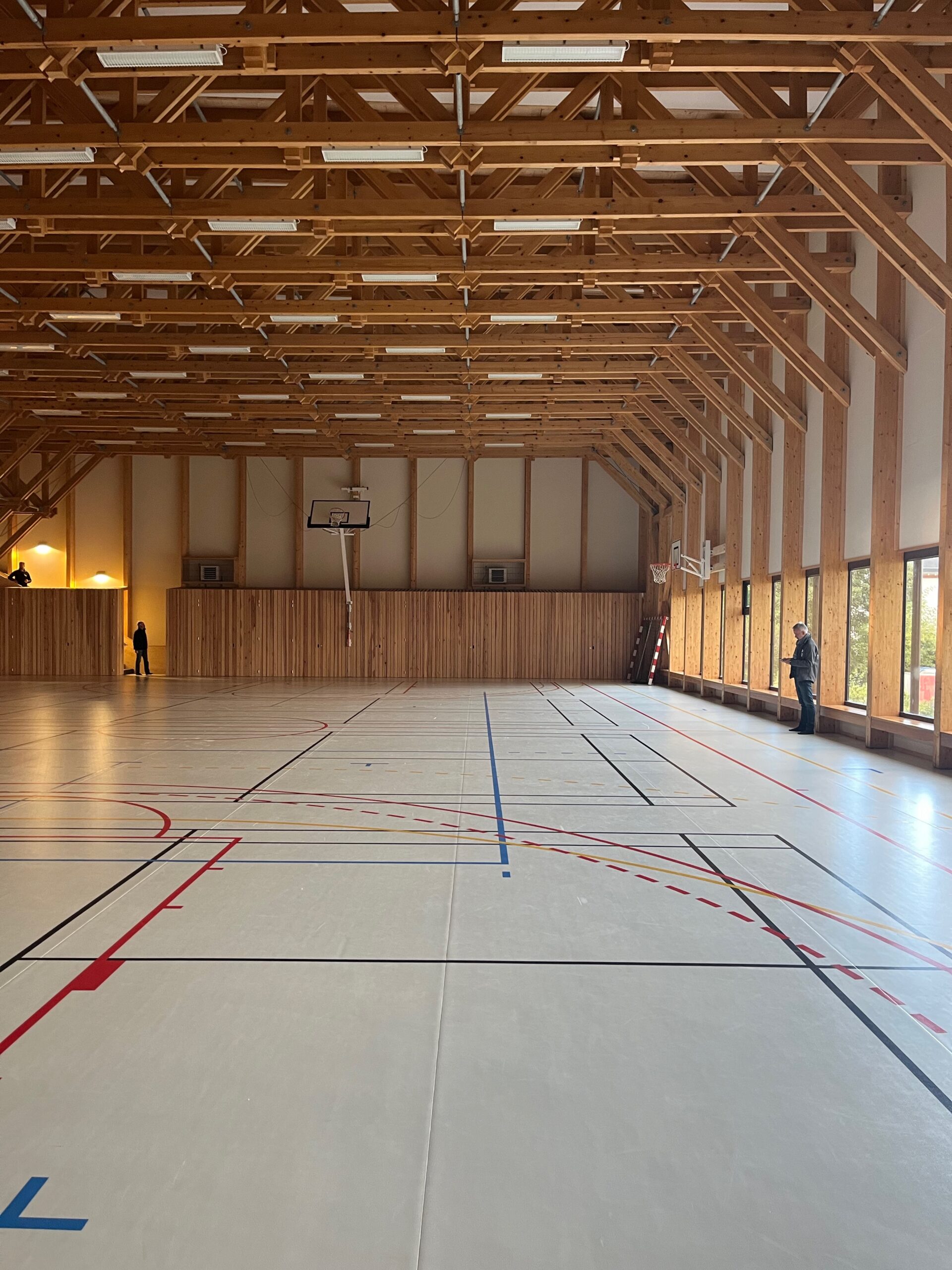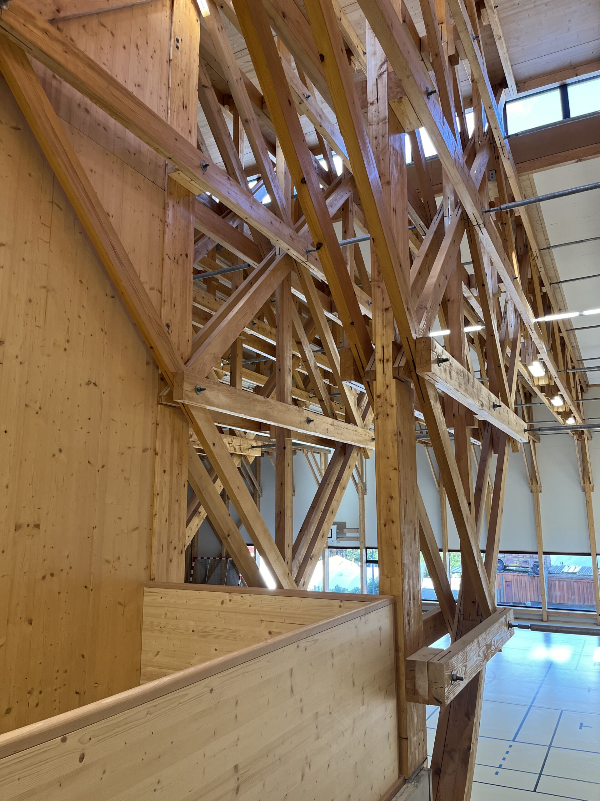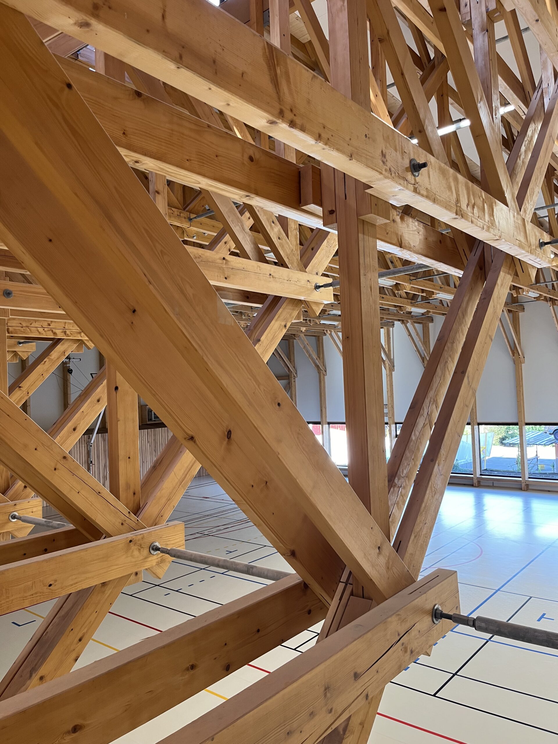 Für die Halle wurden ausschließlich regionale Hölzer verwendet: Fichte für die Struktur und das Gebälk, Douglasie für die Fassadenverkleidung sowie Fichte und Waldkiefer für Schreinerarbeiten innen und außen. Insgesamt kamen 350 m³ Holz zum Einsatz. Die Holzkonstruktion verbindet Stabilität, Nachhaltigkeit und lokale Wertschöpfung, stärkt regionale Betriebe und zeigt, dass Holz ein modernes, ökologisches Baumaterial ist.