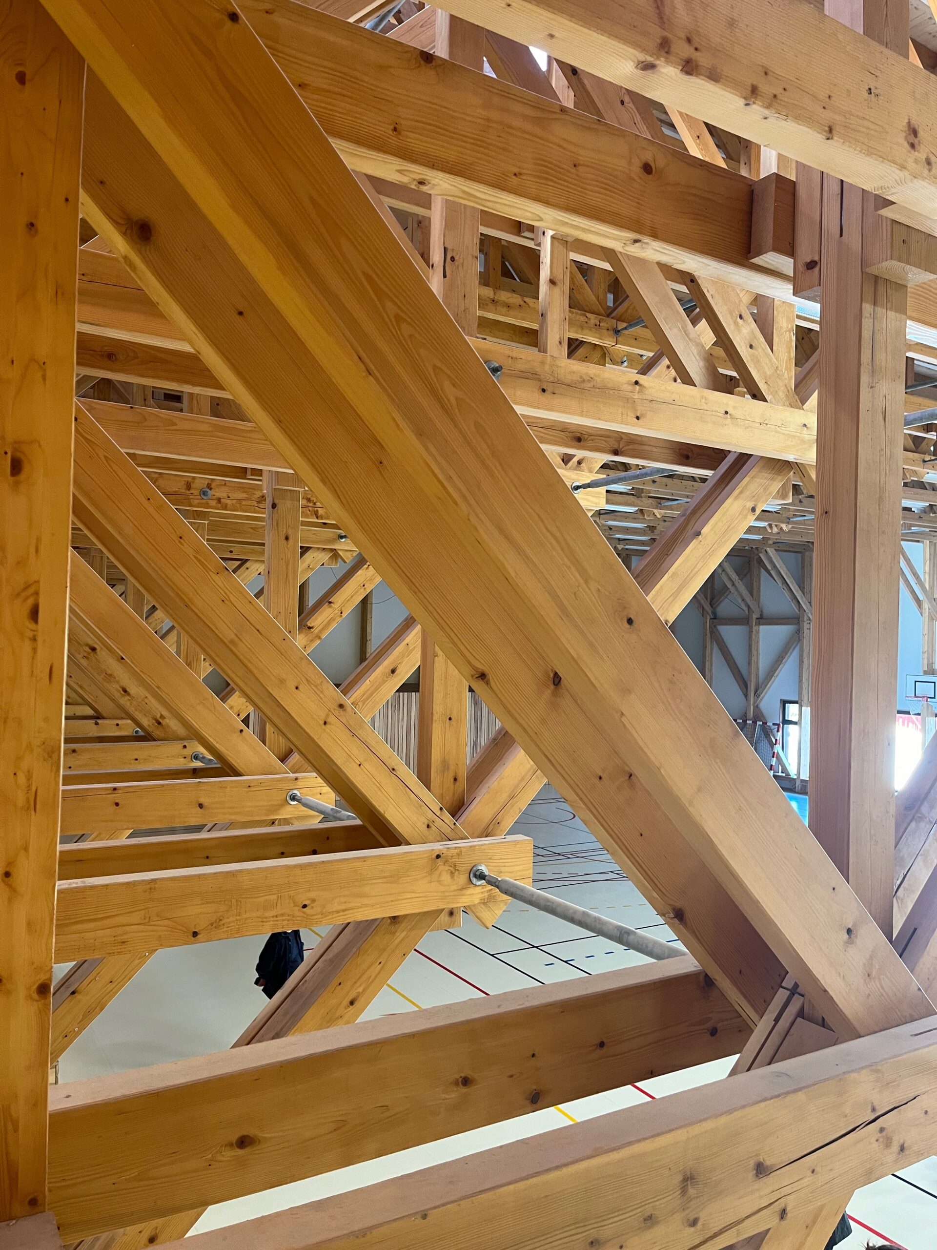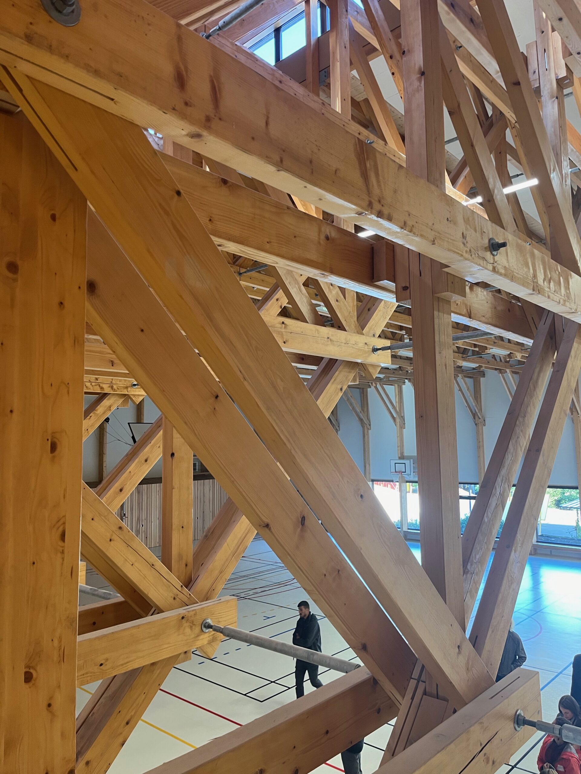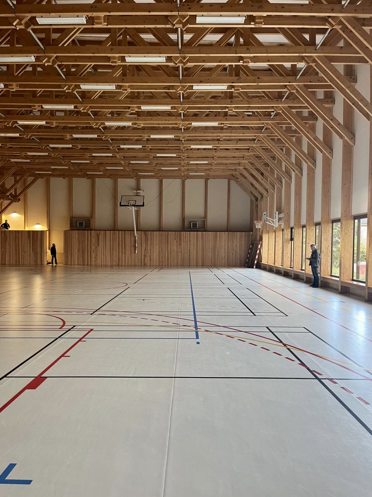 Für die Halle wurden ausschließlich regionale Hölzer verwendet: Fichte für die Struktur und das Gebälk, Douglasie für die Fassadenverkleidung sowie Fichte und Waldkiefer für Schreinerarbeiten innen und außen. Insgesamt kamen 350 m³ Holz zum Einsatz. Die Holzkonstruktion verbindet Stabilität, Nachhaltigkeit und lokale Wertschöpfung, stärkt regionale Betriebe und zeigt, dass Holz ein modernes, ökologisches Baumaterial ist.