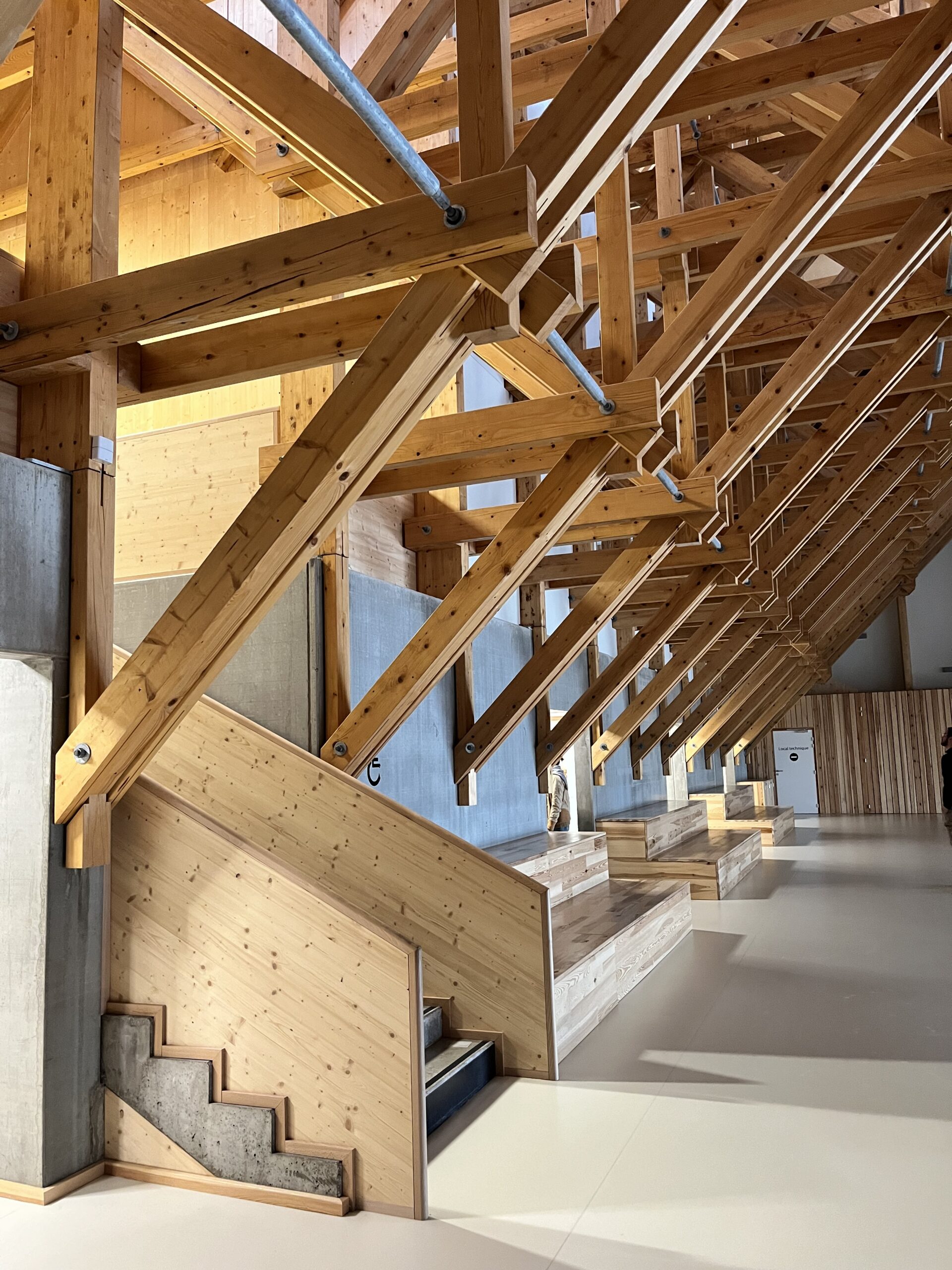 Die Fassade besteht aus Douglasienholzlatten in drei versetzten Lagen, die das innere Holznetz sichtbar machen und ein harmonisches Zusammenspiel mit Stahlblech erzeugen. Innen sorgen Tribünen, Schränke und Bänke aus lokalem Holz sowie vorgefertigte Holzrahmenwände mit Holzwolle-Dämmung für ein angenehmes Raumklima.BAUEN MIT HEIMISCHEM HOLZ