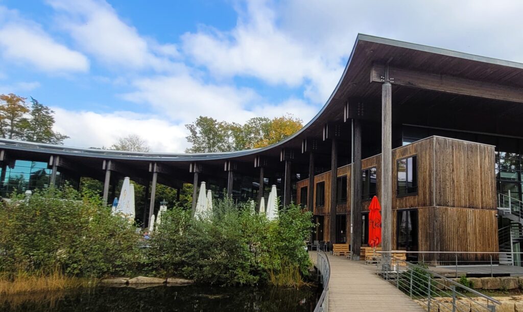 Das Gebäude dient sowohl als Besucherzentrum als auch als Veranstaltungsort. Die Architektur schafft eine transparente Verbindung zwischen Innen- und Außenraum, definiert geschützte Bereiche und integriert sich gleichzeitig in die Waldlandschaft.
